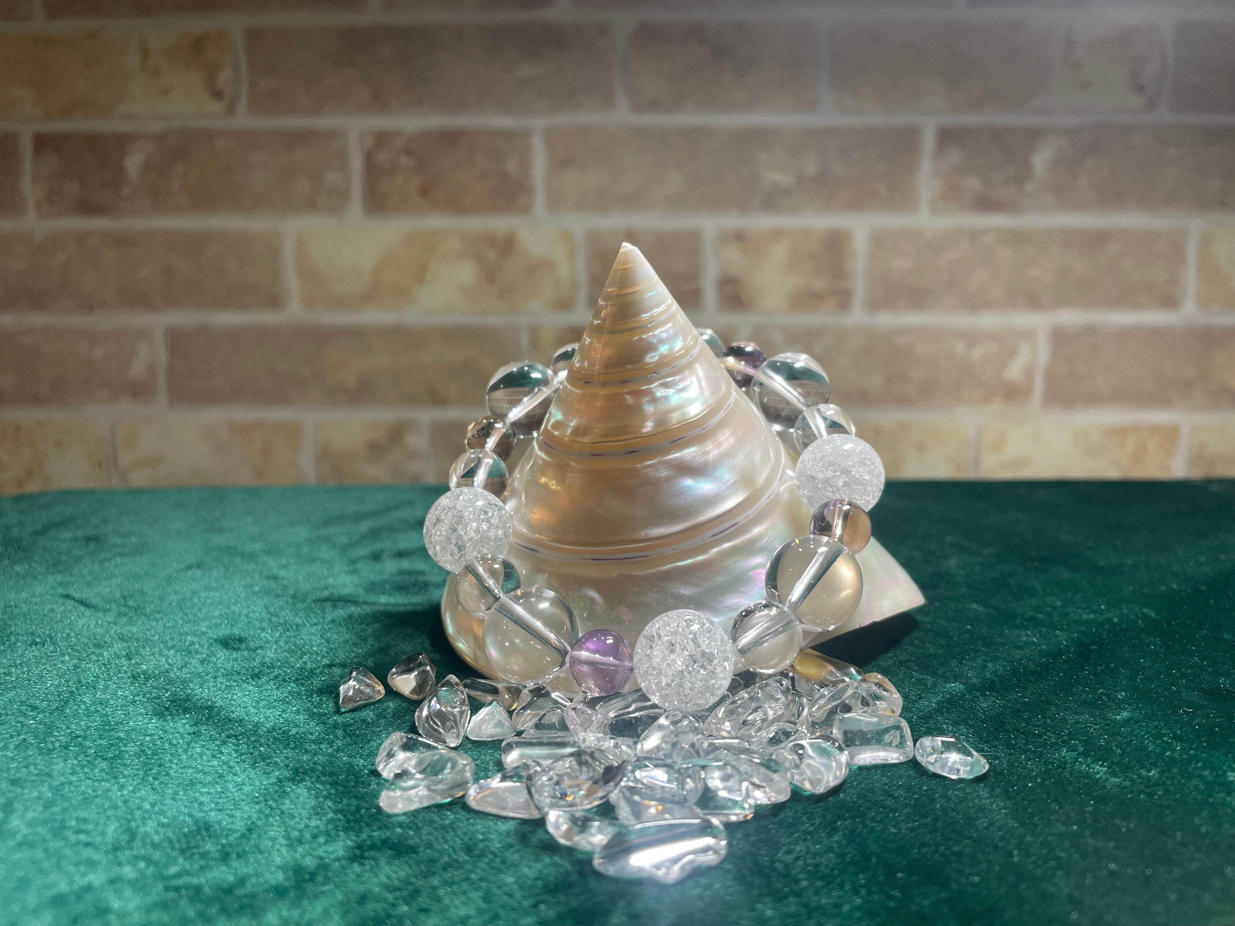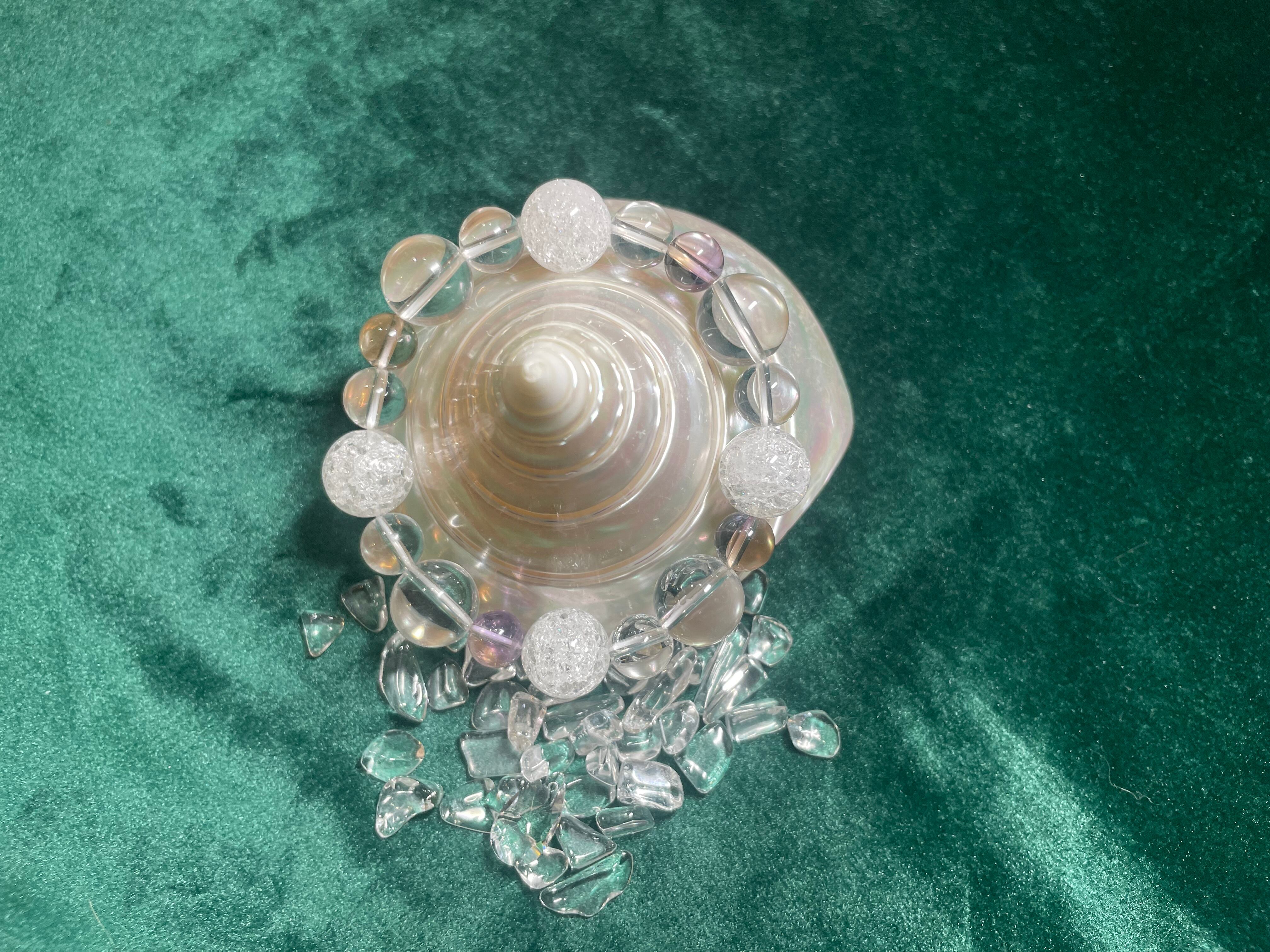 トッププレシャスチャネラー®️今岡怜依から、心を込めて手作りされたスマイリーブレスレットが登場しました。クリア、ホワイト(クラッシュ)、パープルイエローの美しい色調が特徴で、このブレスレットには14mm水晶が使用されています。
