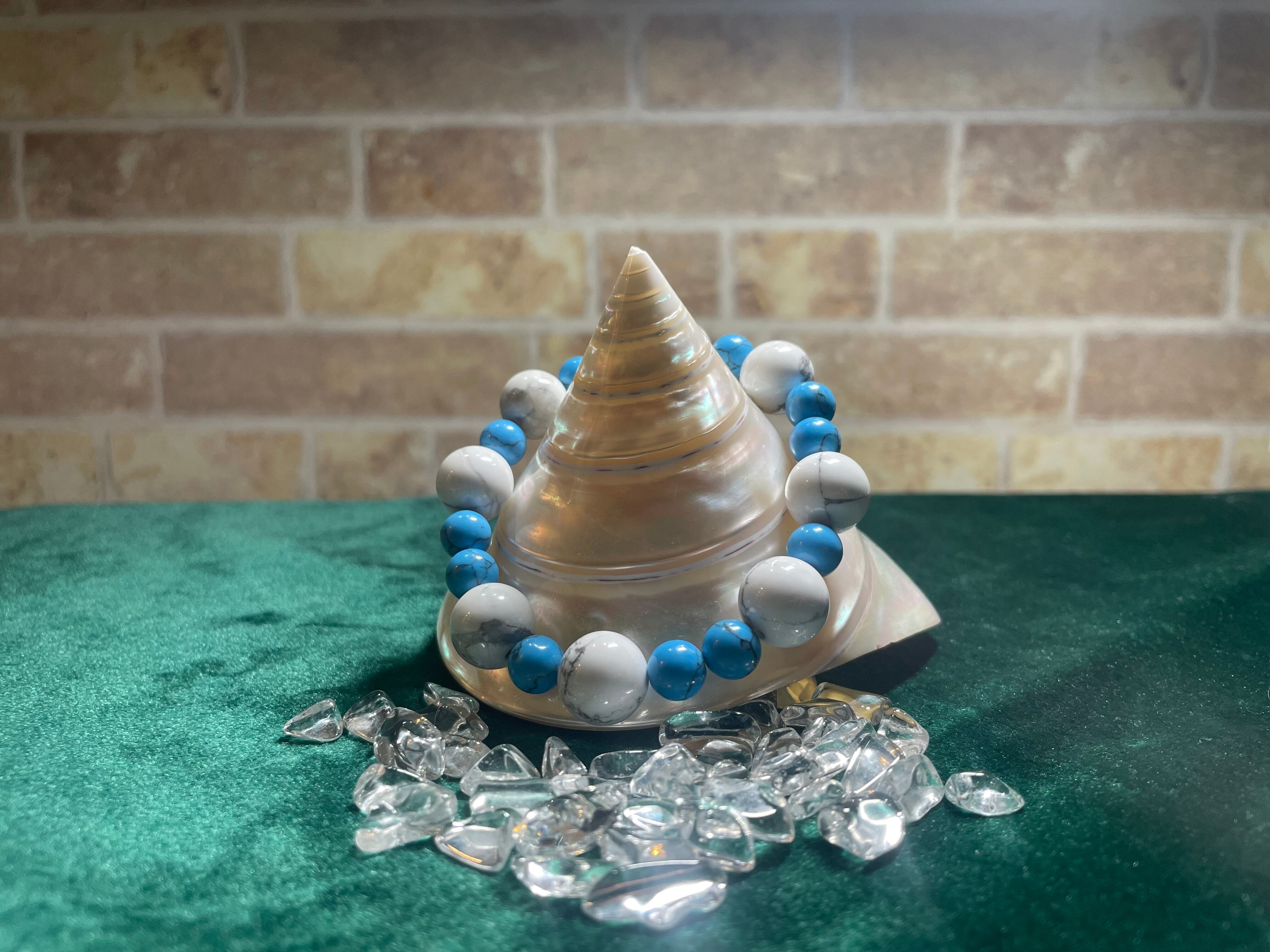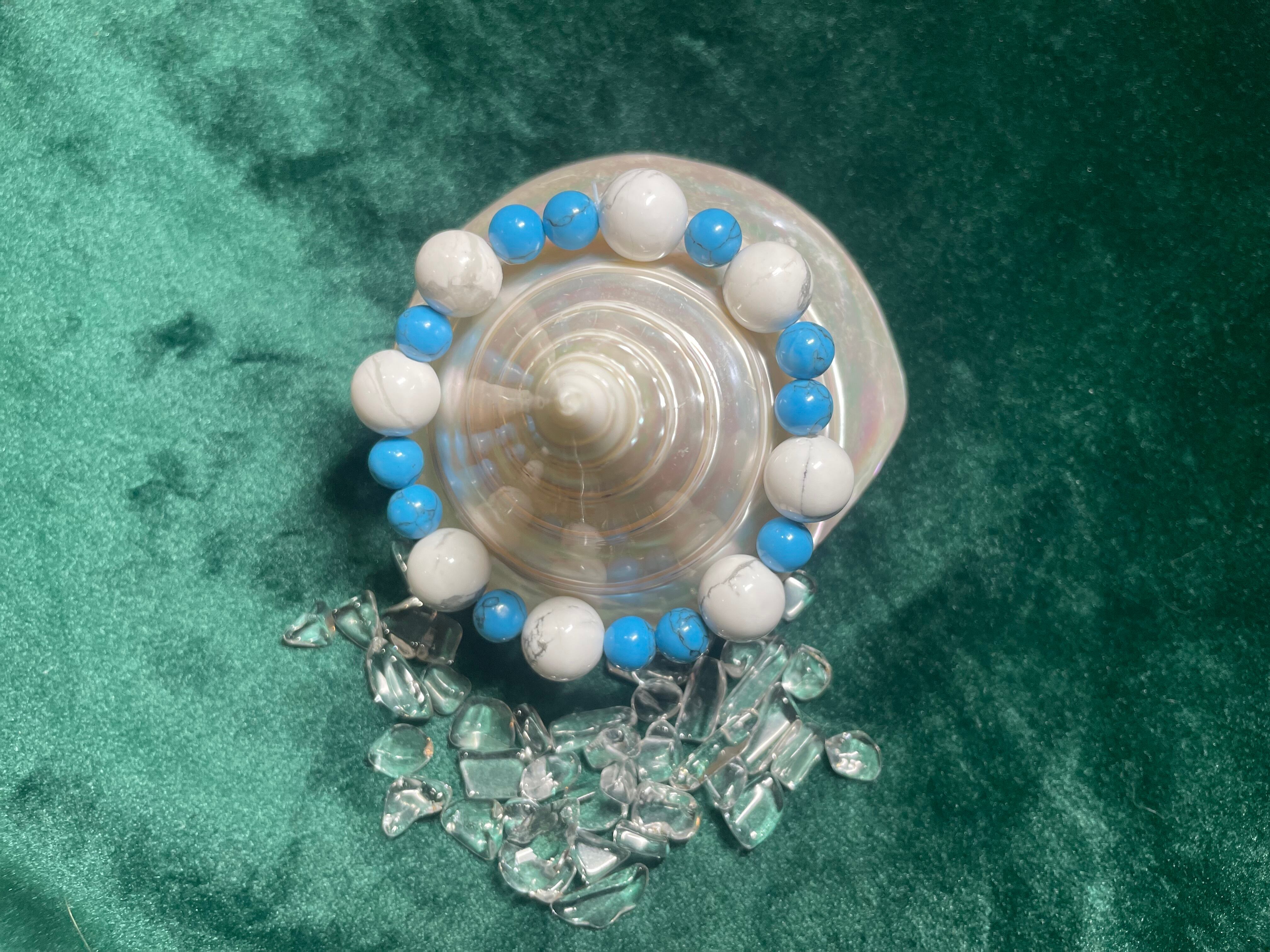 ハウライトはストレス軽減と感受性の向上をもたらし、平穏で叡知に満ちた純粋な気分に導きます。一方で、ターコイズは困難を乗り越えて前進し、コミュニケーション力をアップさせ、日常のストレスを軽減します。