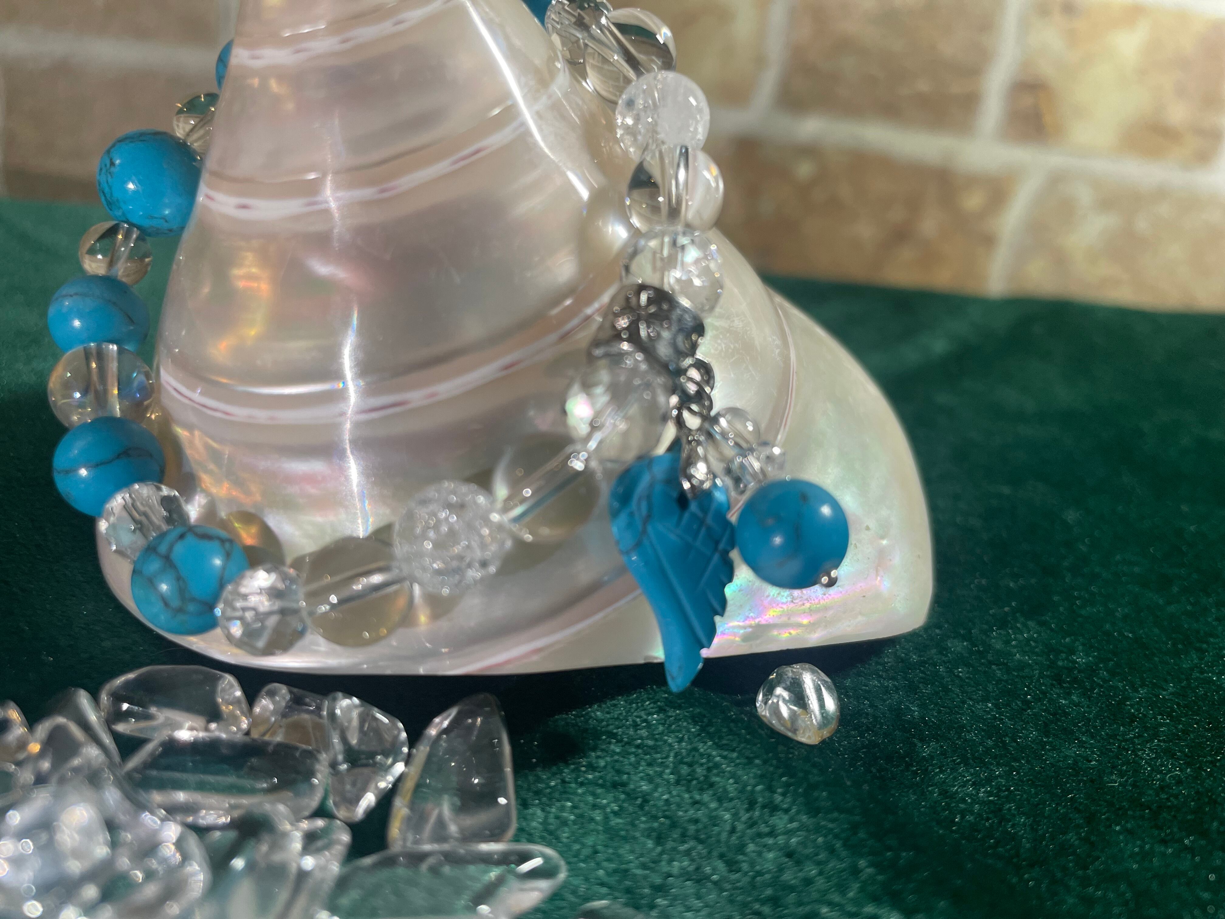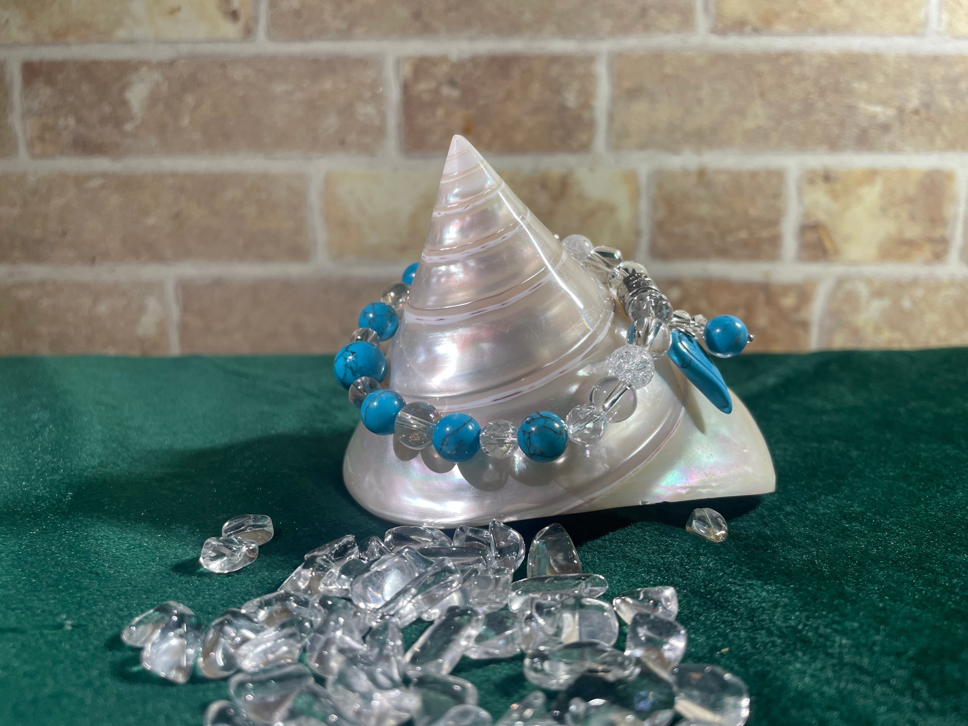 水晶は邪気を払い、幸運を呼び込む効果があり、想像力、直感力、洞察力を高めます。ターコイズは困難を乗り越えて前進し、コミュニケーション力をアップさせ、日常のストレスを軽減します。