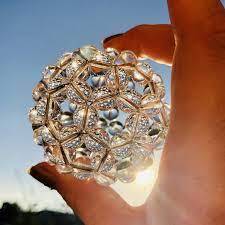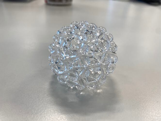 神聖幾何学 フラーレンは、6mm珠を90個使った、エレガントで神秘的なインテリアアイテムです。直径約3.8cmのこのフラーレンは、どんな空間にも調和し、癒しとエネルギーをもたらしてくれます。この特別なデザインは、スピリチュアルな意味を持ち、心を落ち着ける空間を作り出します。